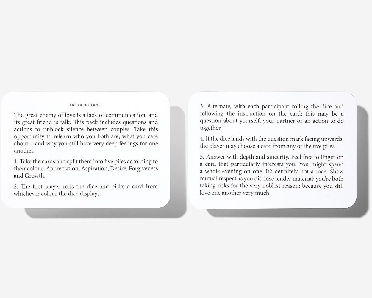 They lead naturally to chats about what we are ready to forgive, what we deeply appreciate, what remains exciting and what is especially worth cherishing. This is a deceptively simple game with life-changing consequences.