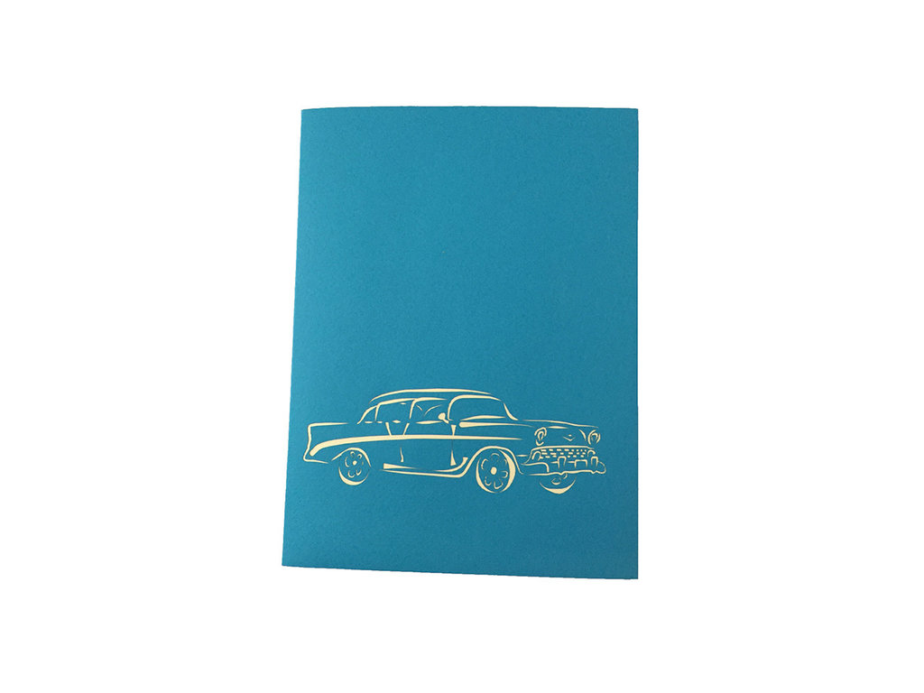 - inside the card is a snazzy 3d turquoise 1950’s buick is surrounded by the colorful skyline of old havana