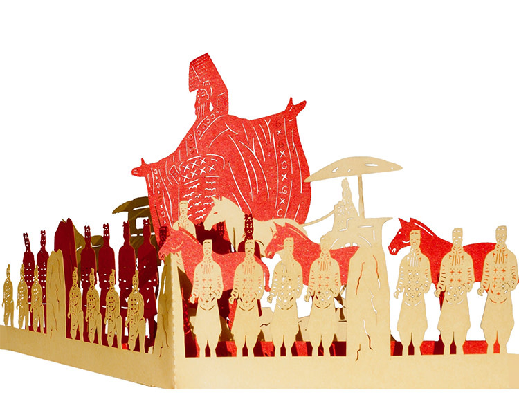 • this remarkable pop-up card imagines the emperor surrounded by his clay soldier imperial guard in battle formation, plus a chariot, horses and weapons